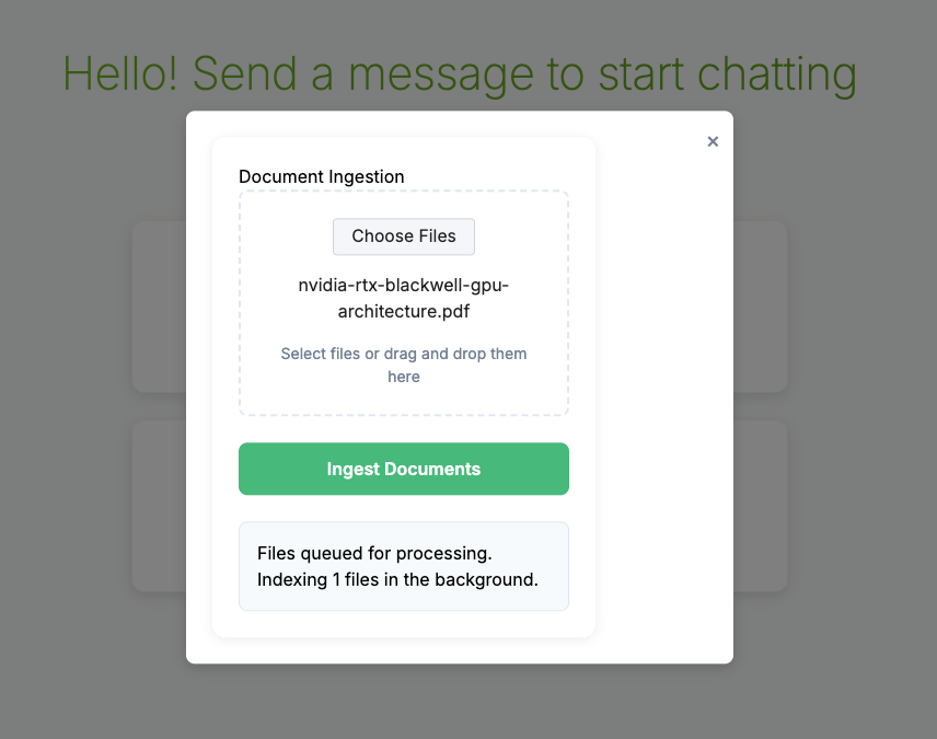 Before trying out the example prompt for the RAG agent, upload the example PDF document NVIDIA Blackwell Whitepaper as context by going to the link, downloading the PDF to the local filesystem, clicking on the green "Upload Documents" button in the left sidebar under "Context" and then make sure to check the box in the "Select Sources" section.
